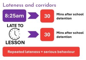 Arriving on time to school and lessons is essential for learning and success. When students are late, they disrupt not only their own education but also that of their peers. To reinforce the importance of being on time, lateness to school or lessons will result in an after-school detention. This is the only detention issued under our system—all other sanctions will follow our layered approach (see below).