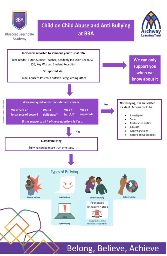 At Bluecoat Beechdale we do not tolerate any form of abuse; this includes Bullying, Harmful Sexual Behaviours and any prejudice or discriminatory behaviour towards any of the Protected Characteristics which include Race, Religion, Disability, Sexual Orientation and Gender Identity to name a few. We have clear mechanisms in place to challenge and resolve any instances of abuse towards our Students. Our Academy community will not tolerate any unkind action or remarks, even if these are not intended to hurt or offend.